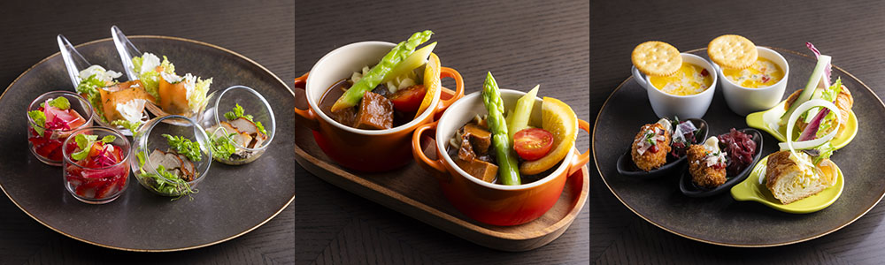 メインディッシュには総料理長おすすめのジューシーな「国産牛ローストビーフ」を。2段スタンドには、「チキンのアヒージョ バゲット」をはじめとし、「アンディーブとリンゴのサラダ 生ハムと」、「洋梨のコンポート ゴルゴンゾーラのグラチネ」、「小柱のグリル焼きと茄子のマリネ」、「焼き安納芋のホットエスプーマ」、「トルティーヤとサルサ」など、1口サイズで6種ご用意し、全7種のお料理でご提供いたします。旬の野菜や食材をふんだんに取り入れ、まるでコース料理を食べたような満足感と、ドリンクとの相性にこだわったメニューです。