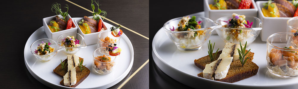 香辛料の薫るパンとトリュフを入れたカマンベールが贅沢な味わいの「カマンベール ア ラ トリュフに パンドエピス」、ヘルシーな食材を合わせ、雪の中に眠る若葉をイメージした「カリフラワーライスと菜の花とチキンブレストのパナシェ」、ロゼ色に焼き上げた鴨肉に、ブレンドした香辛料と蜂蜜の風味が薫り高い「鴨むね肉のロースト キャトルエピスとミエール」、そしてサーモンとクリーミーなマッシュルームの組み合わせが絶妙な「アトランティックサーモンのタルタルとマッシュルームのアラクレーム」をご用意しております。