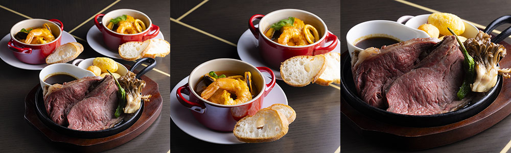 メインディッシュには、甲殻類のエキスと貝の旨味が凝縮した「鮮魚のブイヤベースとガーリックバゲット」、そしてシェフのおすすめ「国産牛のローストビーフ」をご用意しております。