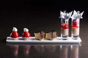 デザートにはクリスマスの雰囲気を感じていただける「ストロベリーケーキ サンタクロースの帽子風」、ペストリーシェフおすすめの「バスクチーズケーキ」、クリーミーなくちどけに仕上げた「チョコレートプリンとベリー オレンジジュレ」の3種をご用意しております。
